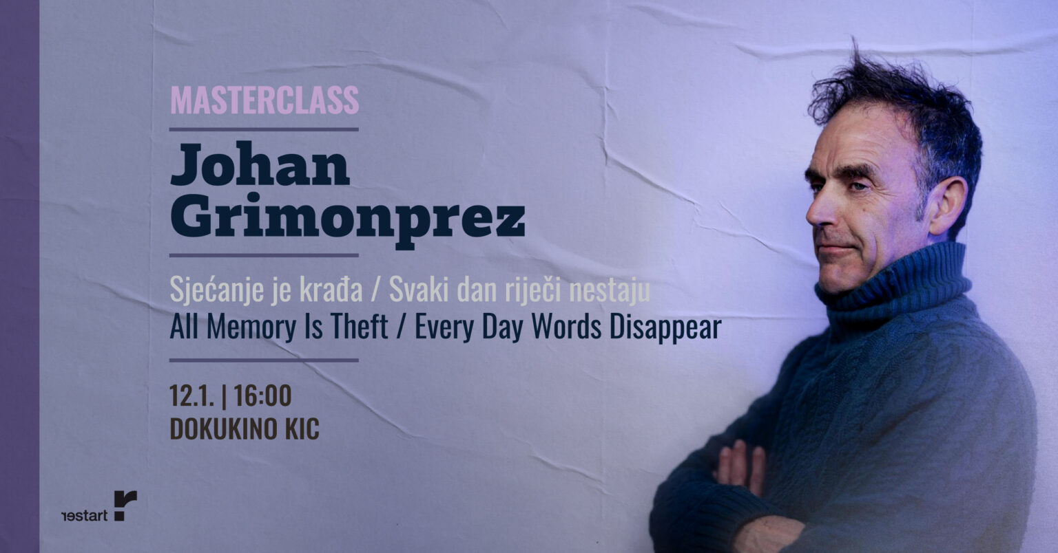 On Monday, January 12th at 4 pm at Dokukino KIC, director Johan Grimonprez will hold a masterclass titled “All Memory is Theft / Every Day Words Disappear” in which he will present his guidelines for reclaiming storytelling and belonging.